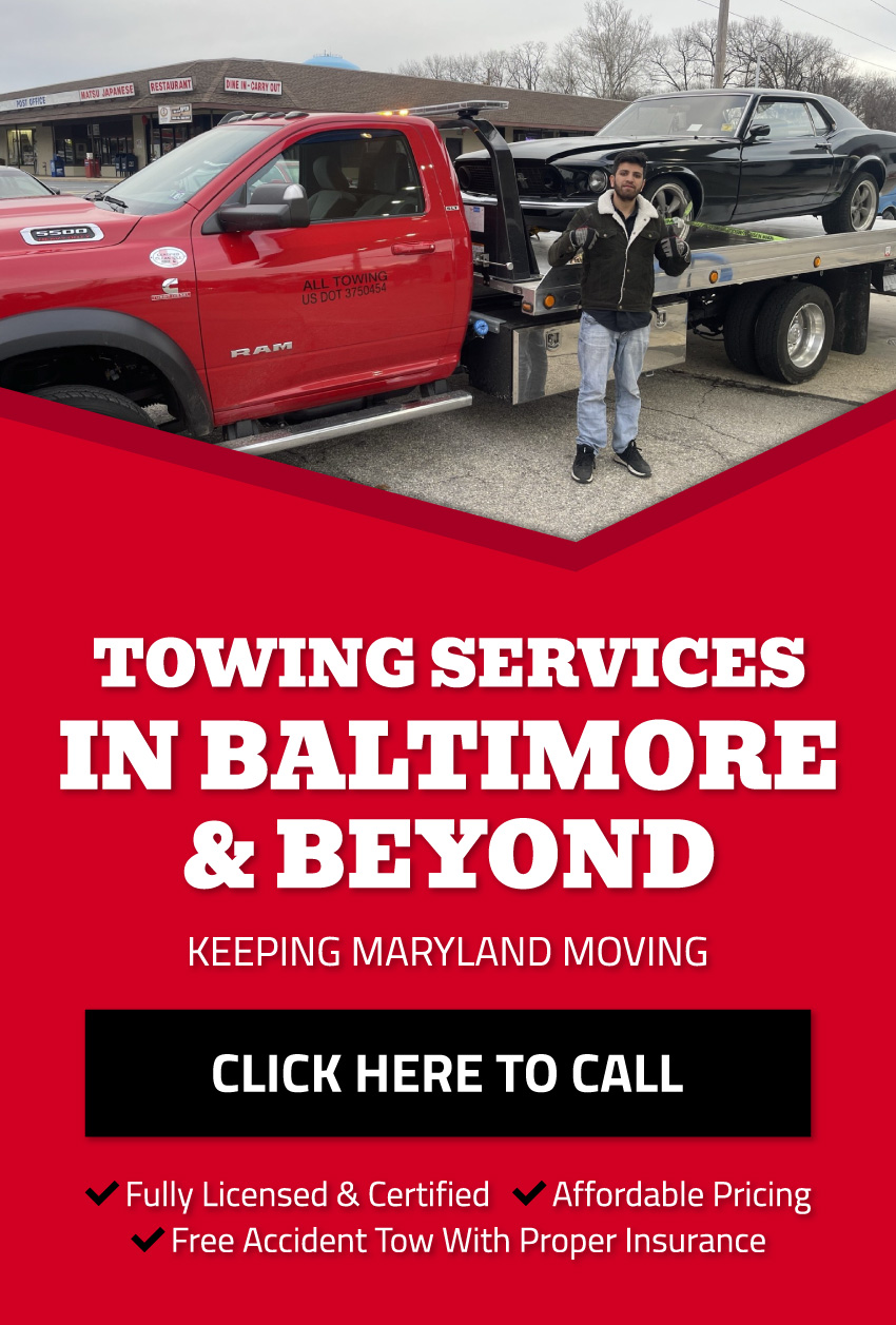 For over half a decade, All Towing has been the trusted, family-owned and operated tow company serving Baltimore, Maryland, and beyond. We pride ourselves on leading the way in professional towing and roadside services. Our friendly and experienced tow truck operators can handle vehicles up to 25,000 lbs, using state-of-the-art equipment and winch-out capabilities to ensure top-quality service. Whether you need a quick battery jumpstart or a damage-free lockout service, we’ve got you covered with affordable, comprehensive solutions. In the competitive world of towing and roadside assistance, we stand out by adding a personal yet professional touch to every service call. We care deeply about easing your stress and providing reliable, efficient assistance when you need it most.
